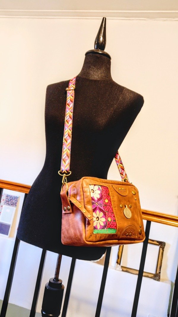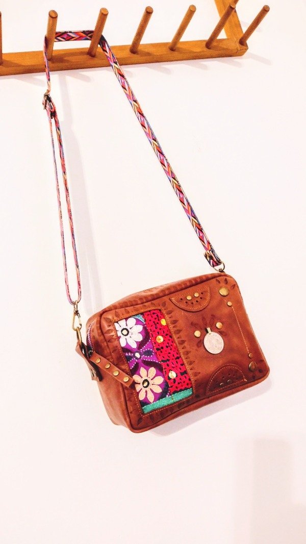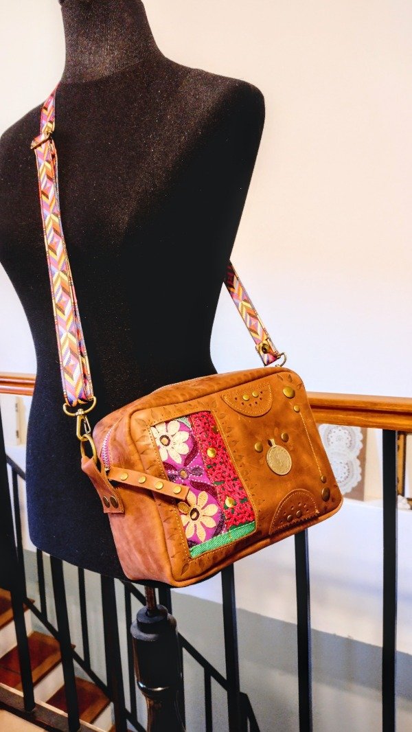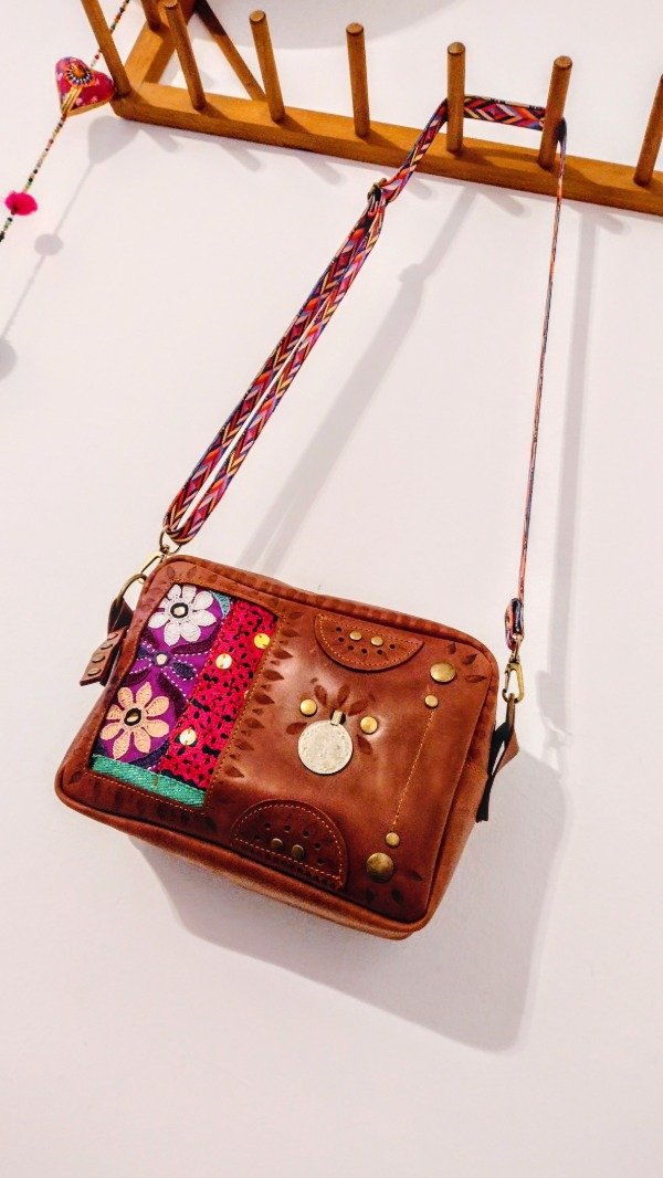 Cartera realizada INTEGRAMENTE en cuero legítimo. TRABAJADA ARTESANALMENTE. CONTIENE DETALLE DE MONEDA ANTIGUA DE LA INDIA. CORREA desmontable y regulable. Herrajes metálicos. Cierres metálicos reforzados. INTEGRAMENTE FORRADA, contiene bolsillo externo trasero e interno. MEDIDAS: alto 18 / largo 22/ prof 10 cm.