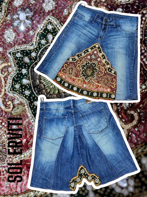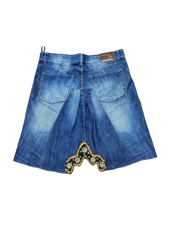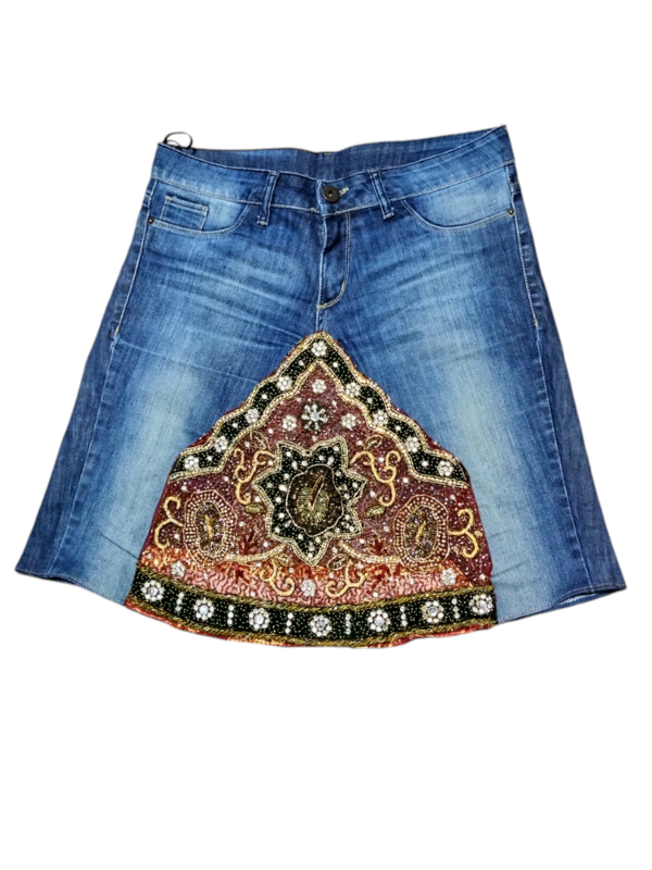 Pollera de jeans . Intervenida con tela India, bordada. Calza divina!!!! Medidas: contorno cintura: 84 cm. Largo : 50 cm.
