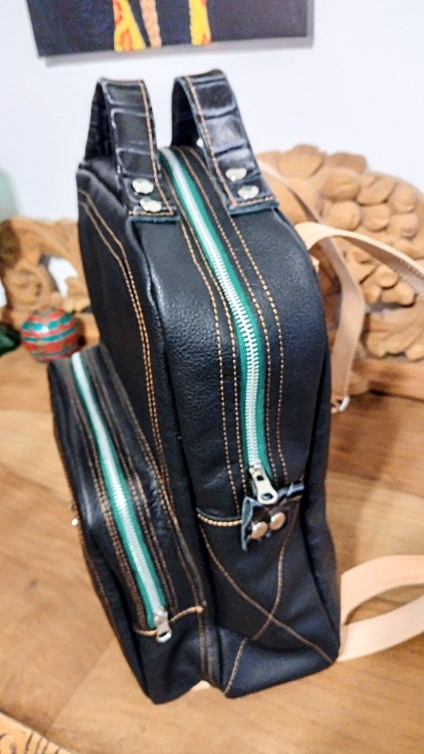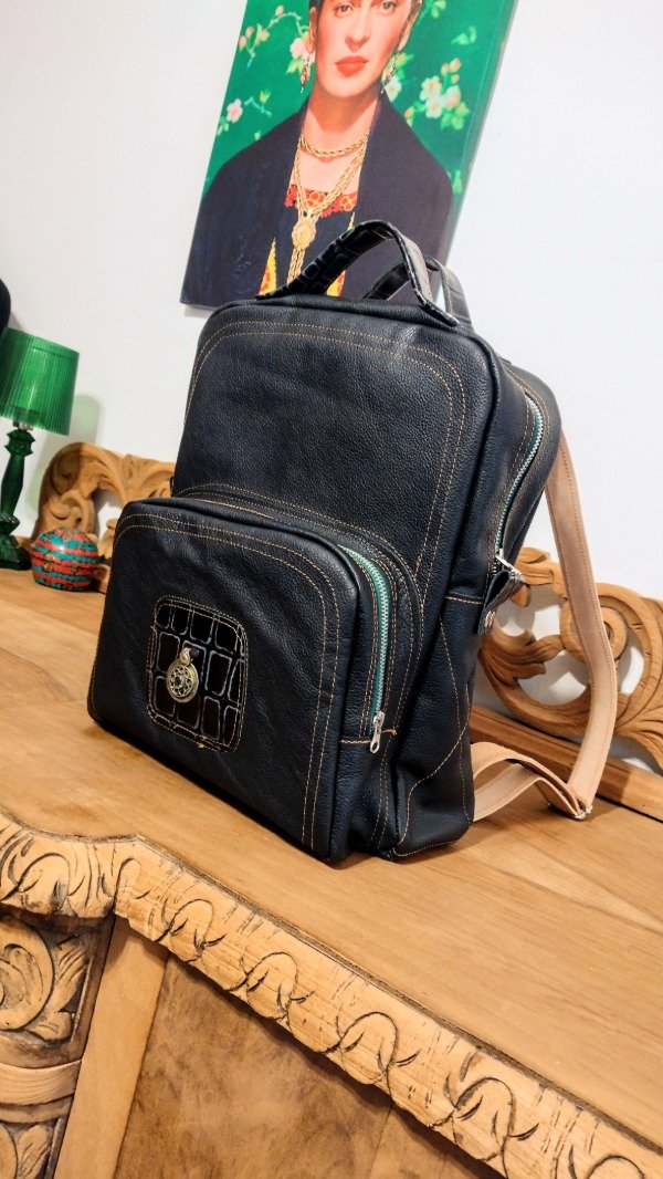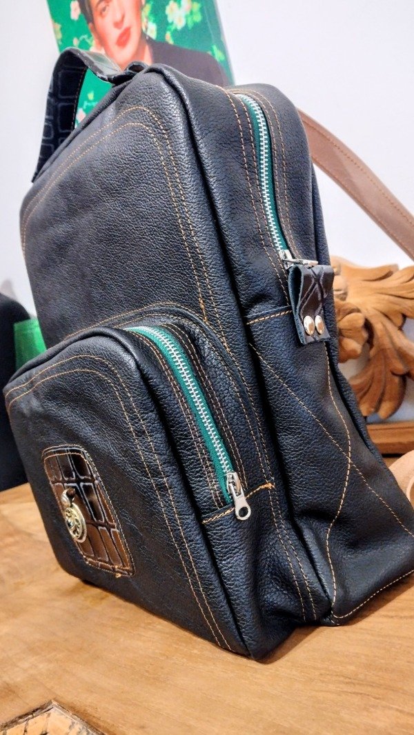 Mochila 100 % CUERO. medidas: 36 cm de alto / 30 cm de ancho/ 10 cm de profundidad. Totalmente forrada. Contiene bolsillo interno. Herrajes metalicos. Cierres metálicos reforzados. ACCESORIO ORIGINARIO DE INDIA.