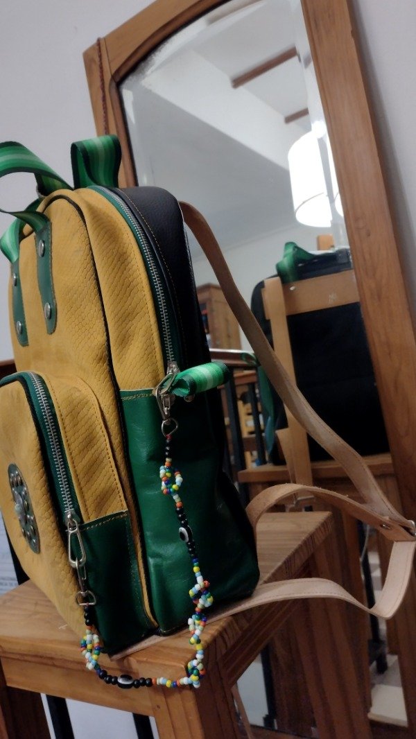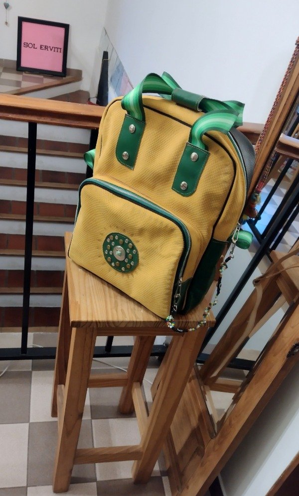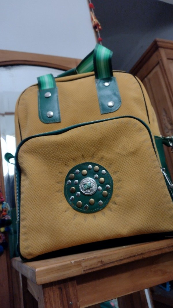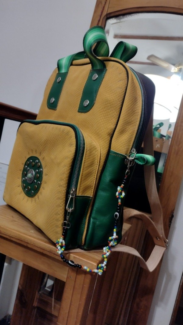 Mochila 100 % CUERO. medidas: 38 cm de alto /32 cm de ancho/ 10 cm de profundidad. Totalmente forrada. Contiene bolsillo interno. Herrajes metalicos. Cierres metálicos reforzados. Correas de cuero, regulables.