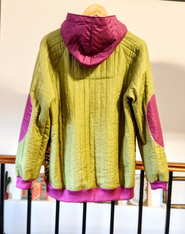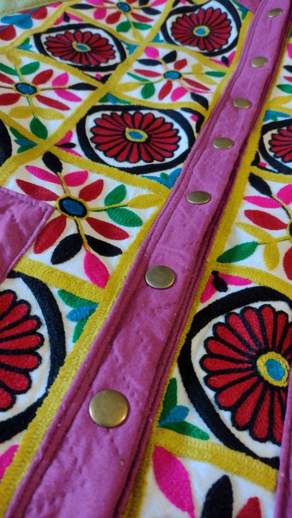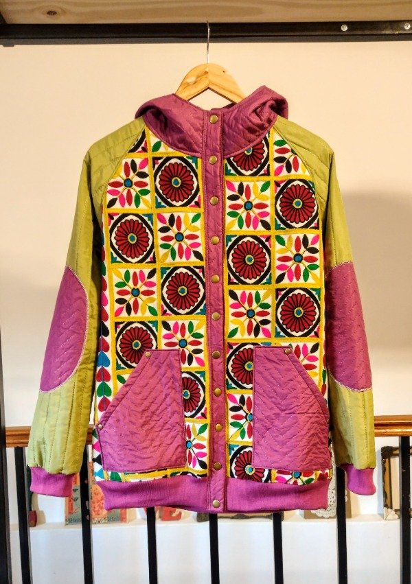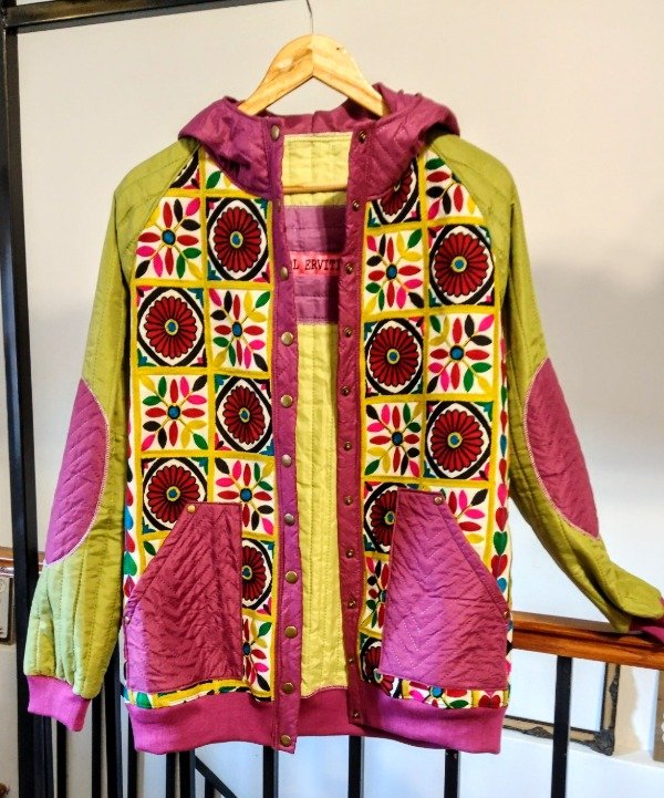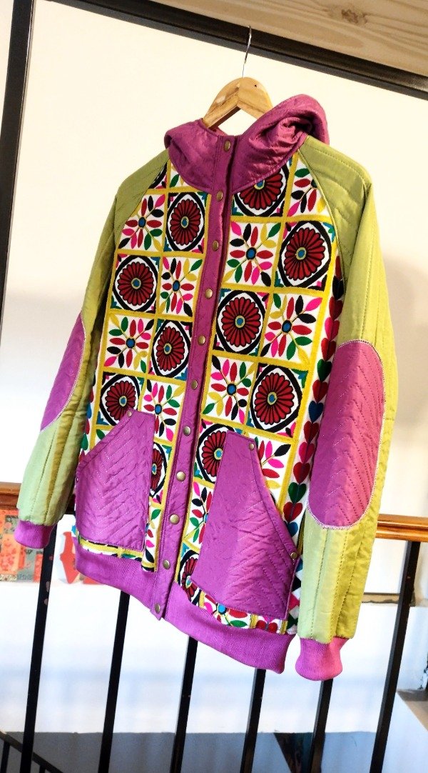 CAMPERA BOMBER CON CAPUCHA. Confeccionada en delantera con textil de India bordado en relieve ,resto de la campera es de matelasse tricapa. .MEDIDAS: LARGO TOTAL 74 CM /LARGO MANGA 60 CM / ANCHO PECHO 60 cm. BROCHES METALICOS.