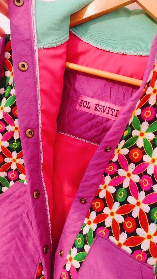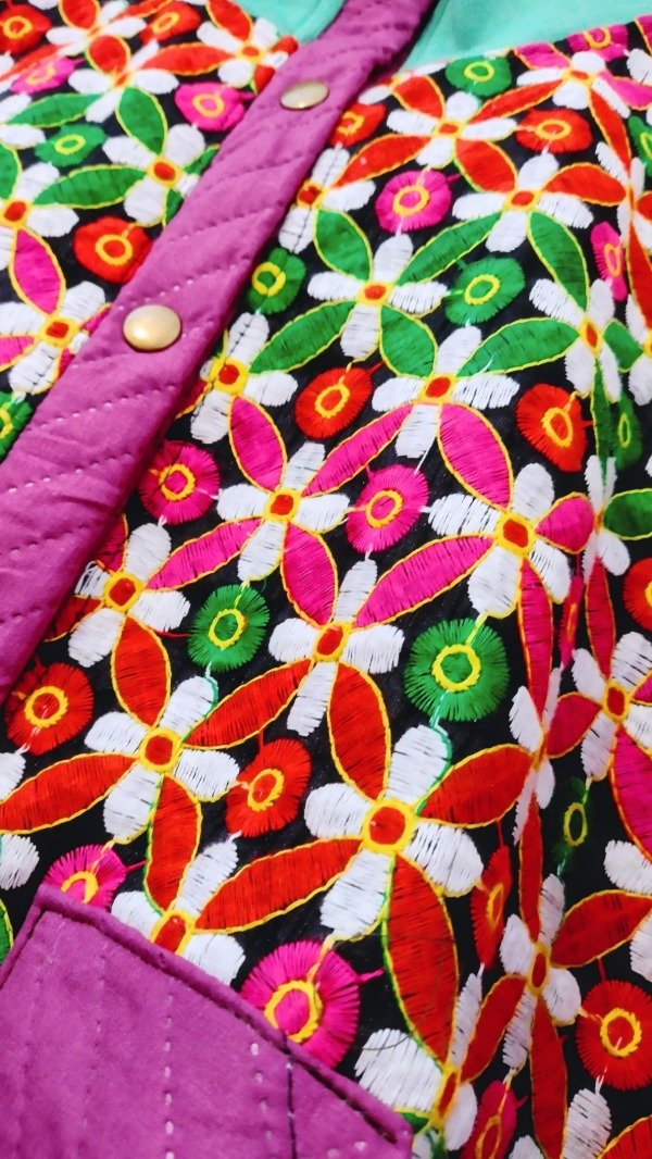 Confeccionada con tela de India bordada, mangas de micro-matelasse. Forrada. . MEDIDAS: LARGO TOTAL 58 CM /LARGO MANGA 58 CM / contorno pecho 104 cm. BROCHES METALICOS.