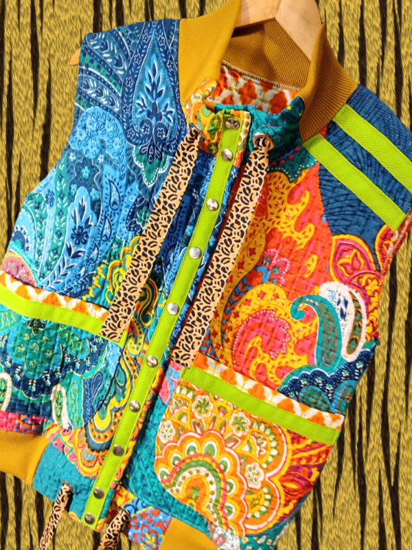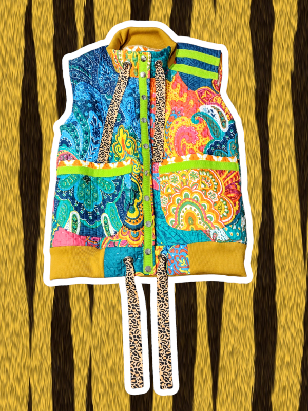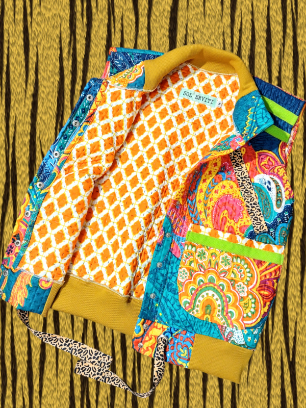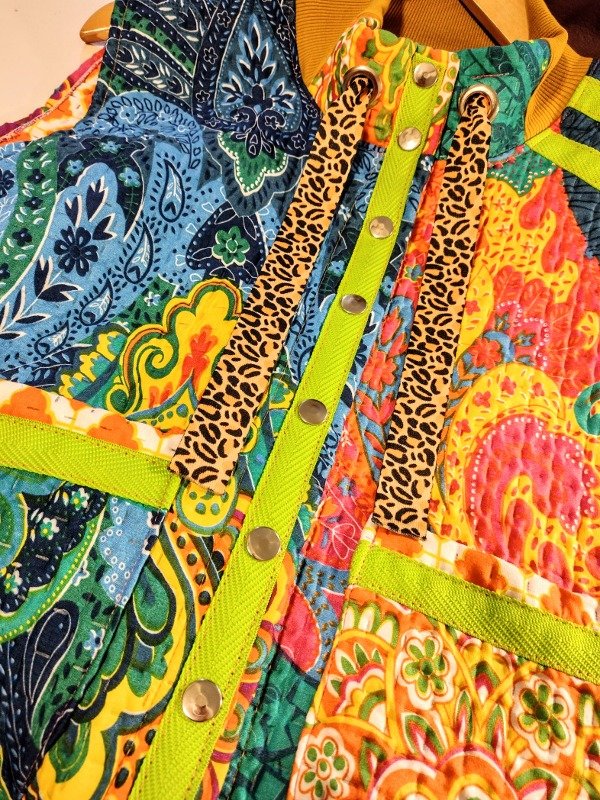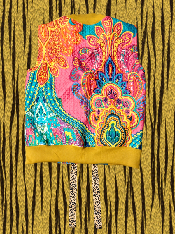 chaleco, textil tricapa, forrado. Broches y hojalillos metálicos. Medidas: largo 63 cm. Ancho de pecho : 52 cm. (Talle M, amplio)